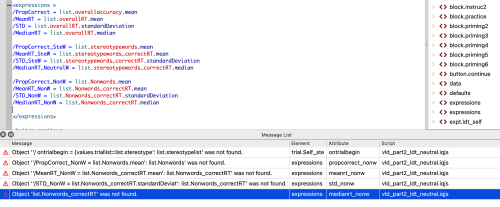 +x Libra - 10/15/2025Hi, I have a script that works in .iqx format. I changed it to .iqjs for running on Inquisit 7. I have made changes such as changing from .currentitem to .currentItem. But now I still have some remaining errors that I cannot figure out how to address. All the errors are related to not finding the list. Please let me know if you have thoughts. Those same codes in the screenshot worked fine when they were in .iqx. Thank you.
